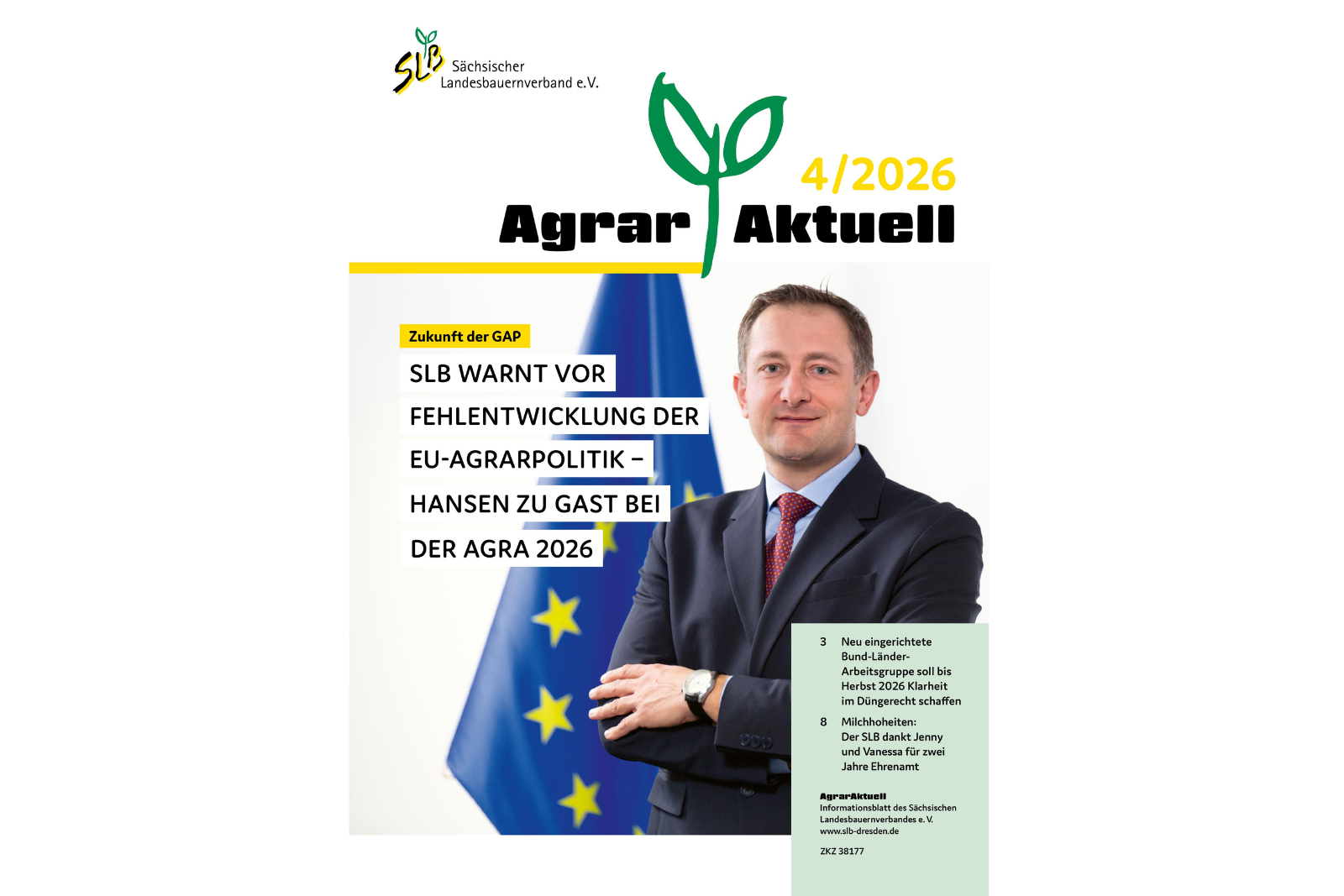 Zukunft der GAP: SLB warnt vor Fehlentwicklung der EU-Agrarpolitik – Hansen zu Gast bei der AGRA 2026 – Antwort der EU-Kommission auf „Berliner Erklärung“ stößt auf deutliche Kritik Agrarministerkonferenz: Neu eingerichtete Bund-Länder-Arbeitsgruppe soll bis Herbst 2026 Klarheit im Düngerecht schaffen Bundesrat stimmt zu: Wolf darf künftig gejagt werden Anhörung im Sächsischen Landtag: Landesbauernverband bringt Praxisperspektive […]